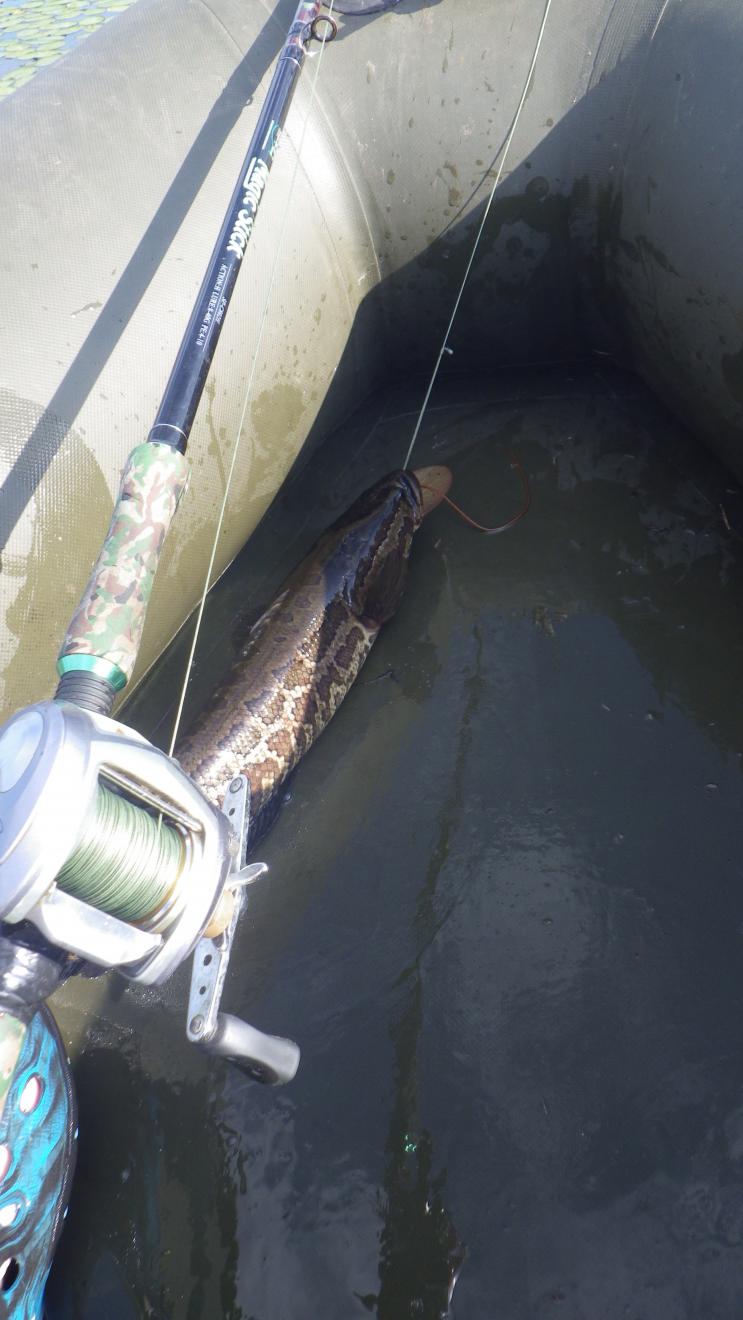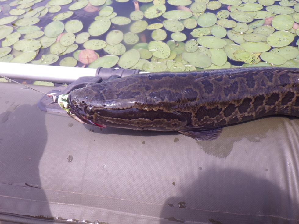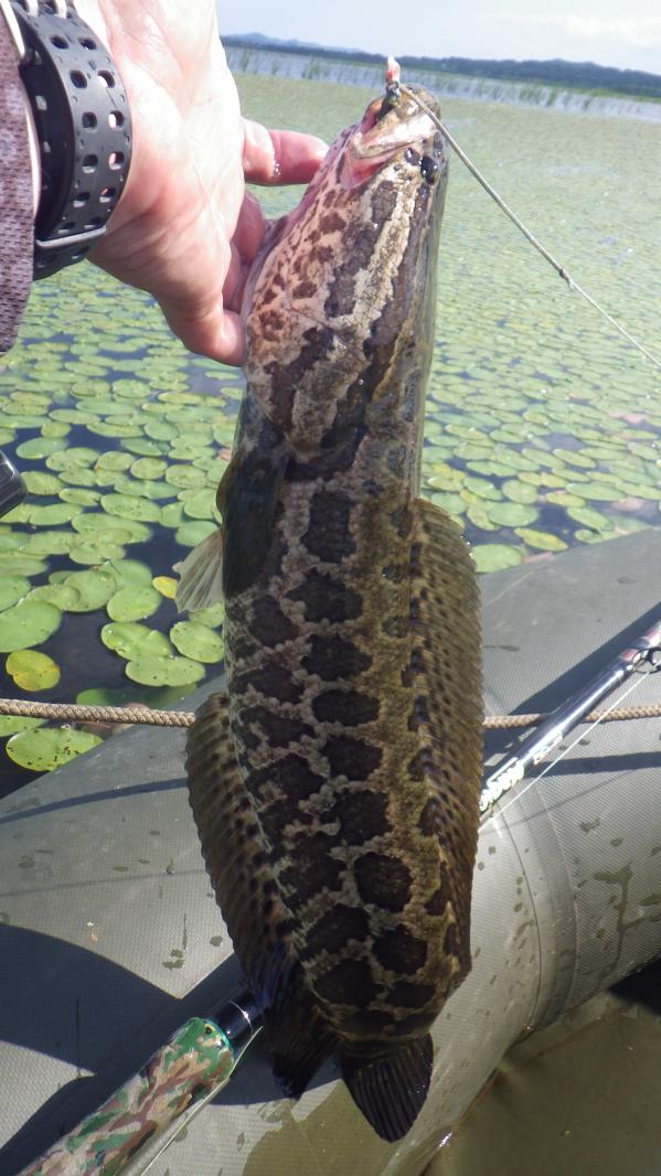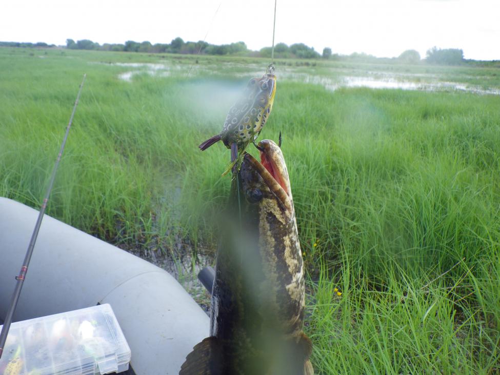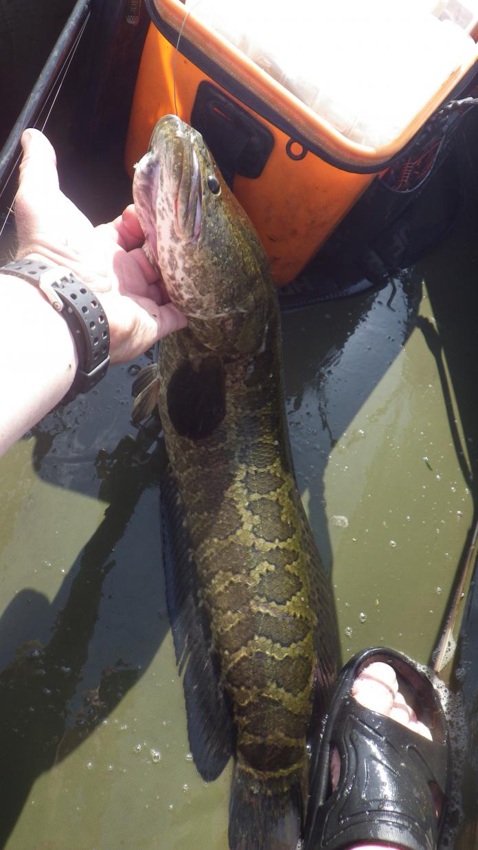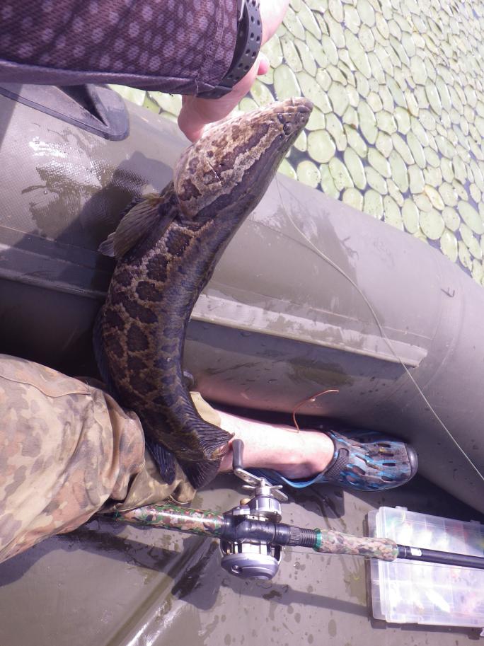 Приехали с югов,гоняли змея....достаточно удачно.С погодой непонятки-солнце/ливень/ветер но змееголов на нересте-полный игнор,лягушка по спинам гонзает ноль внимания,но некоторые особи ведутся,видать не все размножаются.В этой ситуации главное найти этих некоторых....В пятницу с 4 до 7 нашел двух таких и подобрал ключик.В субботу с 11 до 17 взял 10 змеев,дальше пошел ливень с молниями и я 2 часа спасался под мостом....итог полная лодка воды.Саня Субарист так же взял десяток,подлетел Фот и тож зарыбился...В воскресенье за пару часов охоты одна атака и все.Поднялся сильный ветер и начала меняться погода,решил пораньше выскочить в сторону дома....Субарист остался и взял 6 змеев,Фот одного....Как то так....Взяли 30 змееголовов,почти всех отпустили,трофеев небыло.Пара за четверку остальные обычные....НХНЧ